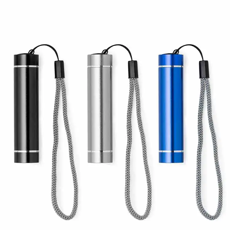 Lanterna bastão plástica com led. Inteira colorida com um anel prata em cada extremo, utiliza uma pilha AA e tem o botão de liga/desliga emborrachado com relevo, acompanha cordão.