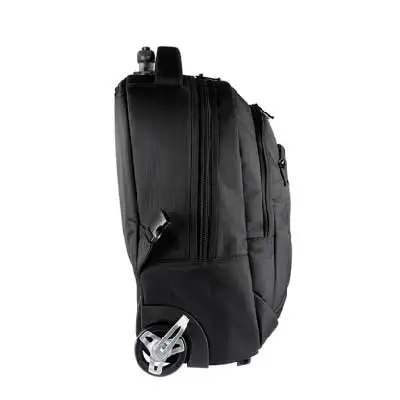 Mochila em poliéster com compartimento para notebook, 2 bolsos frontais com zíper e interior em ripstop 210T. Essa mochila possui rodas, além de alças na parte de trás, para auxiliar no carregamento.