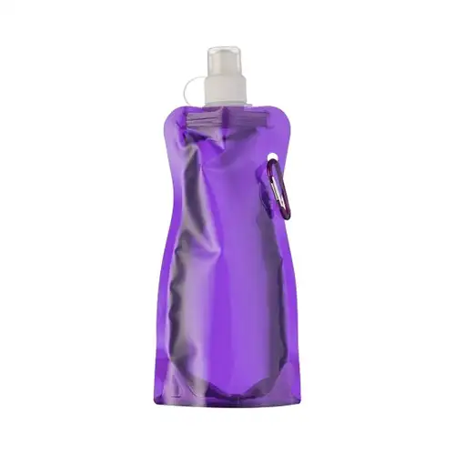Squeeze dobrável de plástico com 480ml. Squeeze colorido acinturado com mosquetão superior de acordo com a cor do squeeze, possui tampa de bico texturizada e protetor plástico para o bico(com alça).