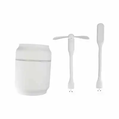 Umidificador de mesa com 200ml de capacidade, funcionamento por 8 horas, carregamento via USB e iluminação colorida, caso desejado. Ele possui uma saída USB para encaixe de lâmpada Led ou ventilador, ambos inclusos na compra.