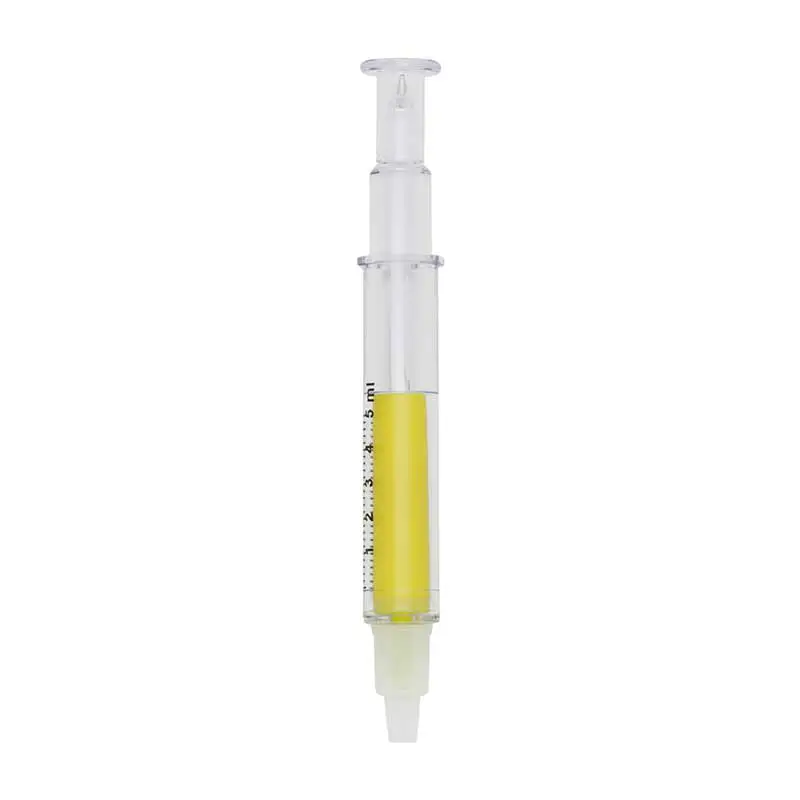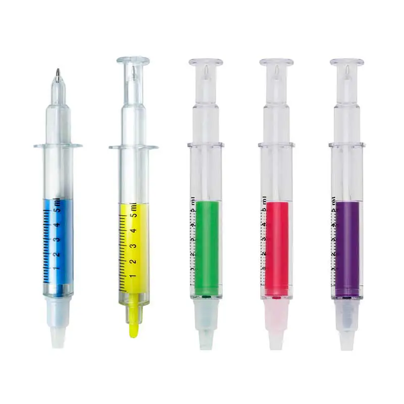 Caneta plástica em formato de seringa, esferográfica e marca texto. Possui medidor imitando uma seringa e tampa protetora nas duas pontas.