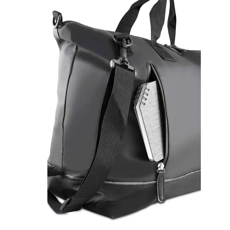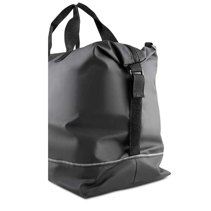 Mala esportiva em PU com revestimento interno em poliéster 210D. Possui faixa refletiva, bolso frontal com zíper, alça de mão e alça de ombro ajustável, além de dois compartimentos internos.