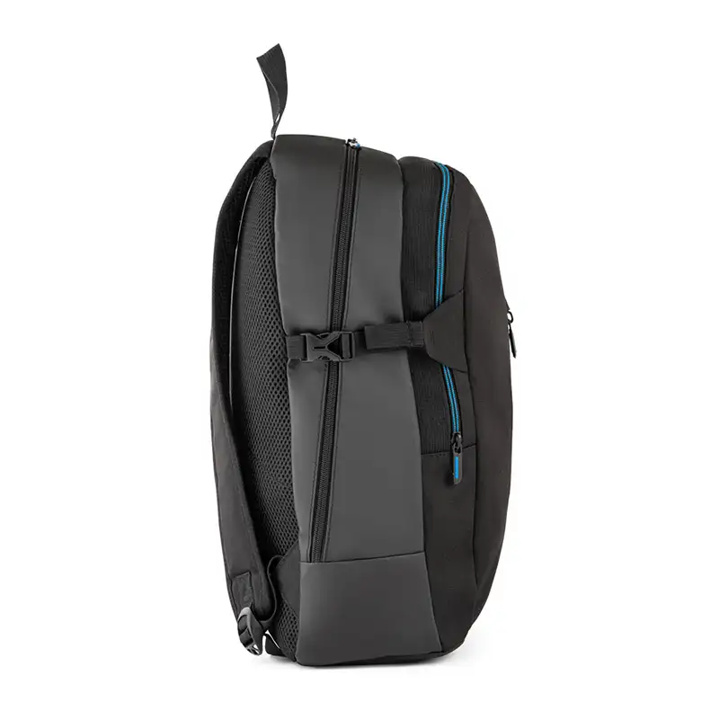 Mochila para notebook em 900D e sintético com 2 compartimentos principais e bolso frontal. O compartimento posterior é forrado e tem divisória almofadada para notebook até 15,6" e bolso em tela, com zipper. O compartimento médio também é forrado e contém divesos bolsos interiores. A parte posterior e alças são almofadadas. 330 x 450 x 160 mm