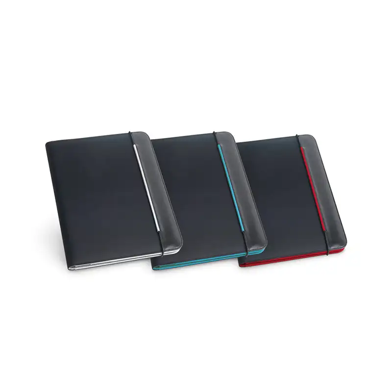 Pasta A4 em sintético e 800D com o interior em microfibra. A pasta contém um elástico para fechar e no seu interior inclui um bloco de 20 folhas pautadas, 3 bolsos e suporte para esferográfica (não inclusa). 245 x 315 x 15 mm