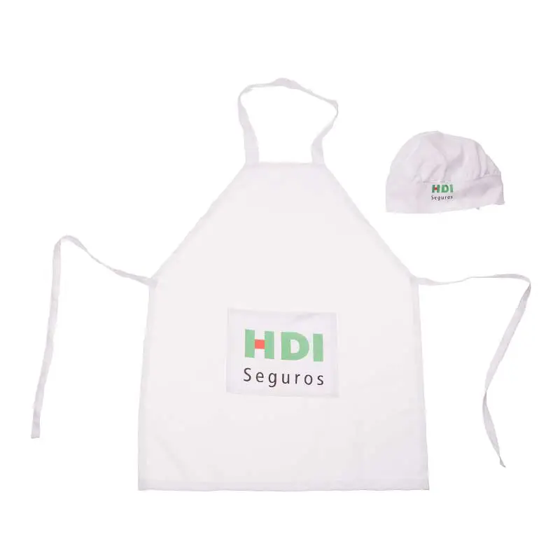 Avental confeccionado em oxford com bolso central personalizado em sublimação. Entrada pescoço e fechamento na cintura em cordão. Chapéu de cozinheiro em oxford personalizado em sublimação.