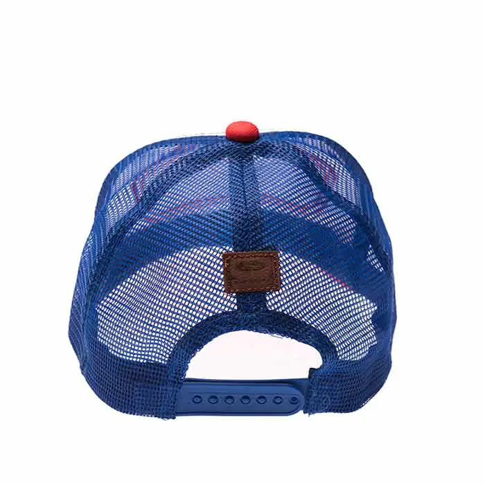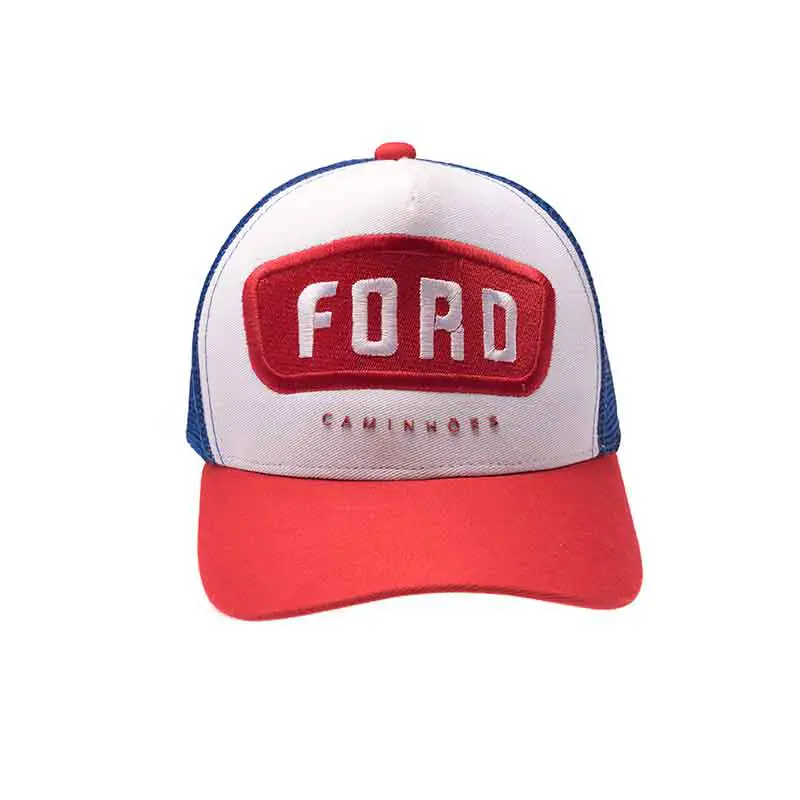 Boné modelo trucker, aba curva em brim na parte frontal e tela atrás. Etiqueta costurada em material sintético e fechamento regulador de plástico.