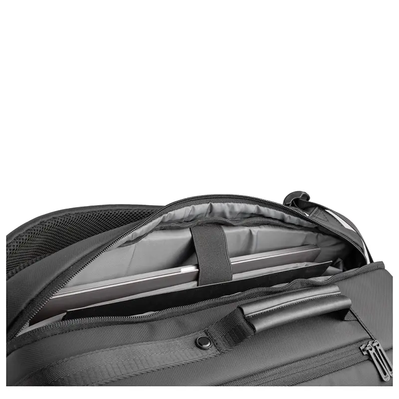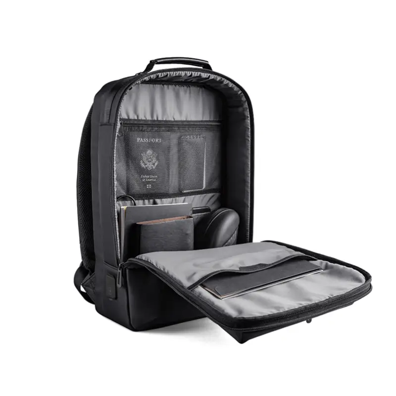 Mochila premium, produzida com poliéster acolchoado, alças de ombro acolchoadas, interior com divisórias com zíper para acomodar pequenos objetos, bolso frontal com zíper e na parte das costas uma divisória atrás do engate para mala de viagem, aceita notebook de até 15,6”, porta USB na lateral.