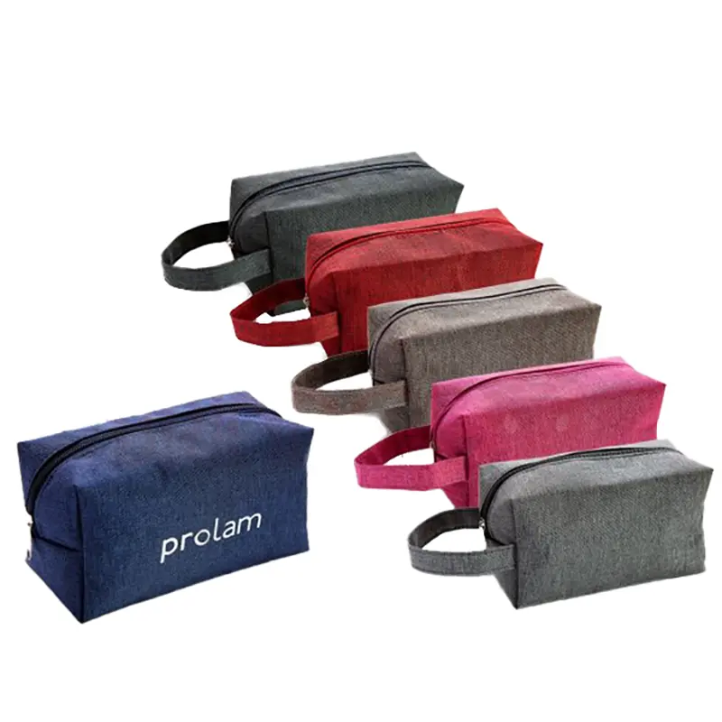 Nécessaire confeccionada em Tecido Monte Carlo 100% Poliéster Revestido com Policloreto de Vinila, podendo ser com alça ou não.