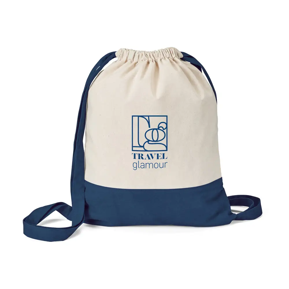 Sacola tipo mochila 100% algodão (180 g/m²), com alças para fechar na parte superior.