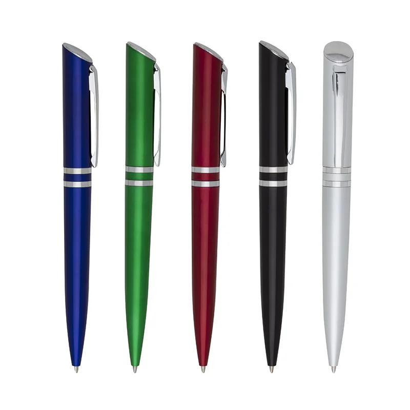 Descrição: Caneta plástica com carga esferográfica azul e acionamento por rotação.