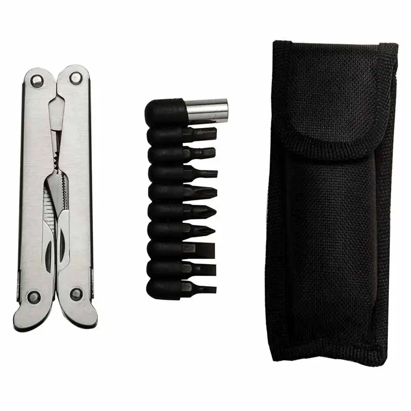 Alicate de metal retrátil com 21 funções. Possui: alicate normal/bico meia-cana, corta arame, lâmina grande, lâmina pequena, formão, abridor de garrafa, chave de fenda quadrada, serra, régua, lima, abridor de lata, adaptador e jogo com 9 pontas mais utilizadas. Acompanha bainha de nylon.