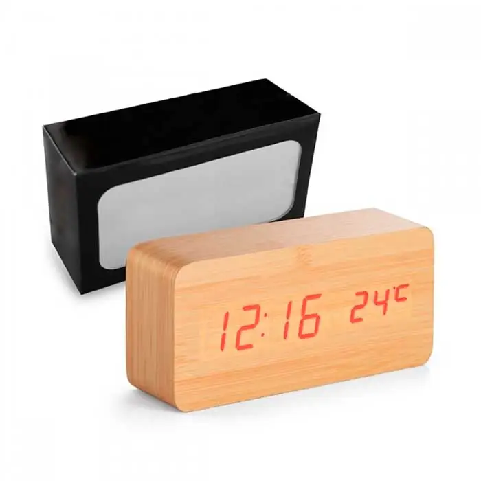 Relógio. MDF. Com calendário, alarme e termômetro. Incluso 4 pilhas AAA, 1 pilha CR2032 e cabo USB. Incluso caixa. 150 x 70 x 44 mm | Caixa: 170 x 92 x 54 mm