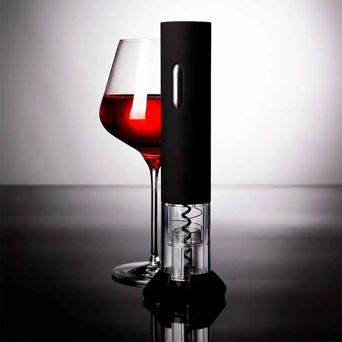 Saca rolhas com cortador de lacre. Parte superior emborrachada e parte inferior acrílica, possui compartimento na parte posterior para 4 pilhas AA. Parte inferior com cortador de lacre (removível).