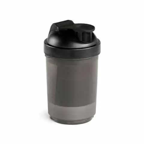 Shaker em PP e PE. Com 2 compartimentos para guardar suplementos adicionais (320 ml e 150 ml). Com escala de medição até 500 ml/16 ft oz. Capacidade: 630 ml. Food grade. ø92 x 160 mm | Montado: ø92 x 225 mm