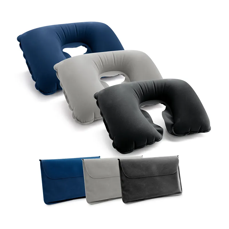 Almofada de pescoço inflável em PVC aveludado. Fornecida em bolsa.