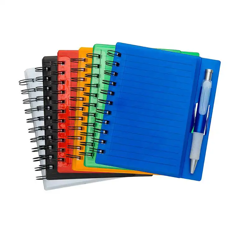 Bloco de anotações com caneta e suporte para encaixe, bloco com wire-o e caneta plástica com detalhe emborrachado, carga esferográfica na cor azul e acionamento por clique.