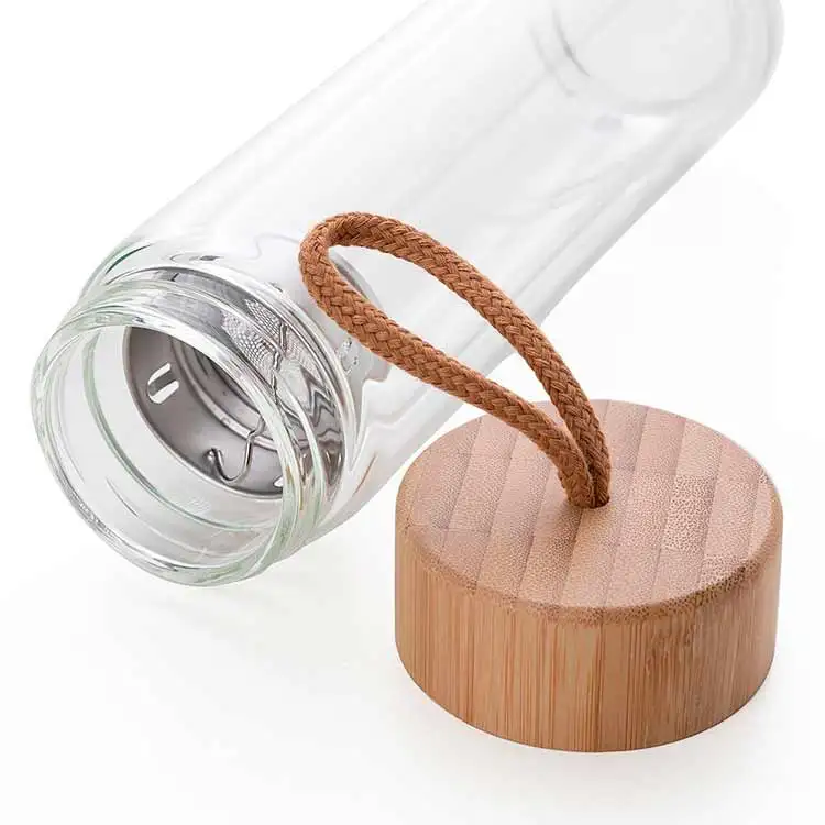 Garrafa de vidro 360ml com parede dupla e infusor de metal. Contém tampa rosqueavel de bambu e alça de tecido embutida.