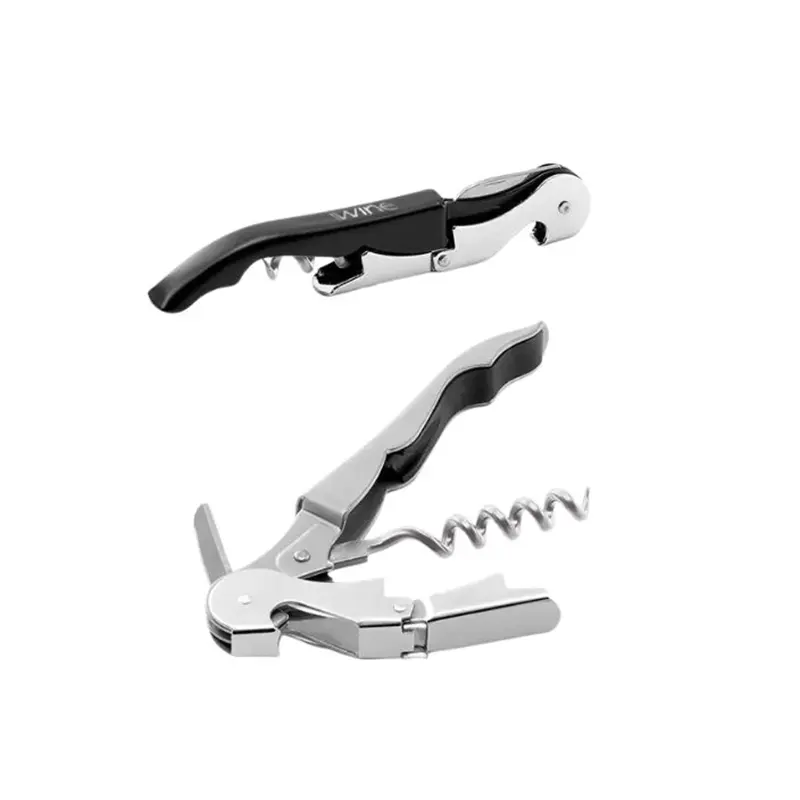 Saca-rolhas manual modelo Sommelier em aço inox com acabamento natural ou em pintura epóxi de cor preta. Tem abridor de garrafas, canivete rerilhado e saca-rolha espiralado com cabo alavanca em aço inox moldado. Mede 121 mm de comp. x 20 mm de lar. x 12 mm esp. e o logotipo e estampado a laser no cabo.