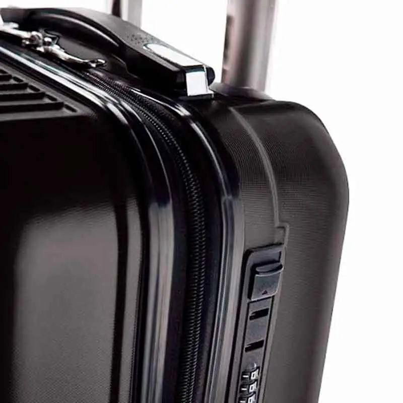 Conjunto de 2 malas de executivo. ABS e PET. Interior forrado, com divisória. 4 rodas duplas giratórias. Pega extensível em alumínio, com mola (altura pega estendida mala cabine: 525 mm, altura pega estendida mala grande: 500 mm). Fecho de segurança com senha. Chapa metálica removível para fácil gravação.