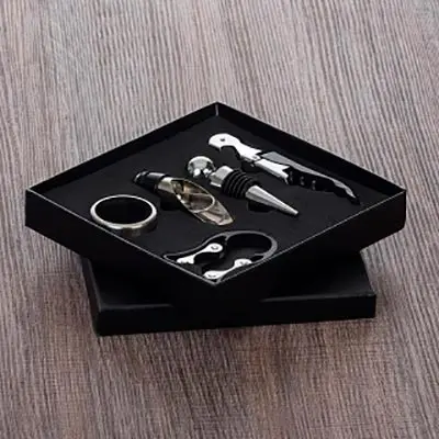 Kit vinho 5 peças em caixa de papelão. compartimento interno revestido com espuma resistente. Possui Wine collar, saca rolhas,cortado de rolhas, abridor, bico condutor com tampa e tampa de bico. Caixa na cor preta.