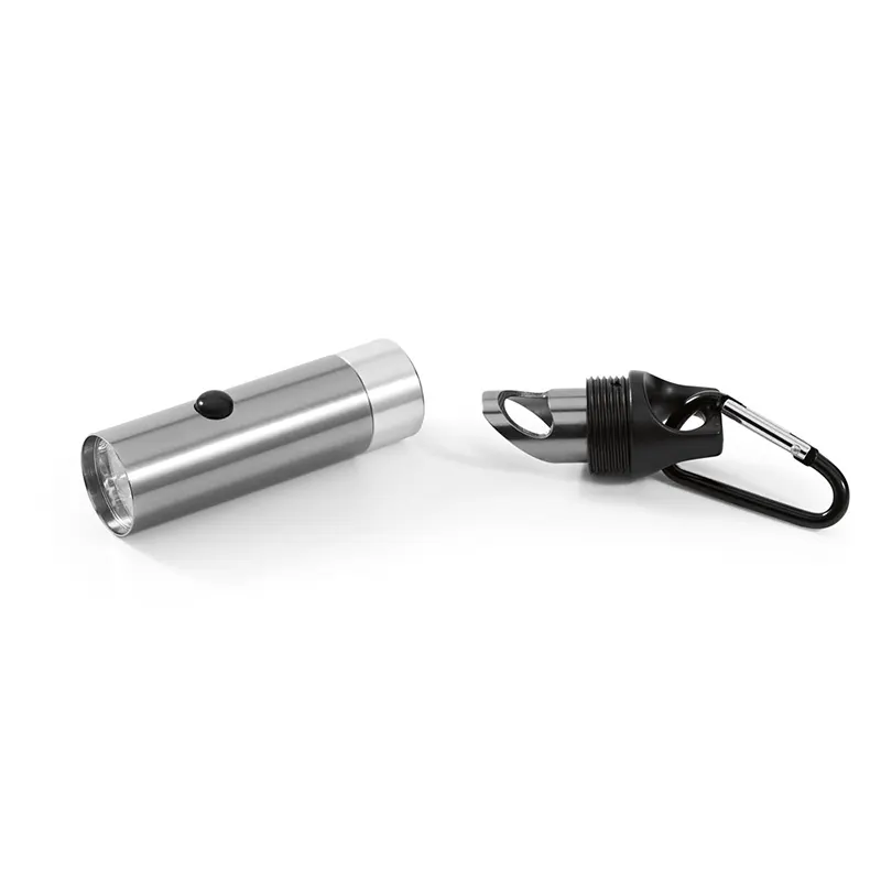 Lanterna de alumínio com 6 LEDs, abridor de garrafas e mosquetão. Acompanha 2 pilhas CR2032. Dimensões: Ø25 x 102 mm.