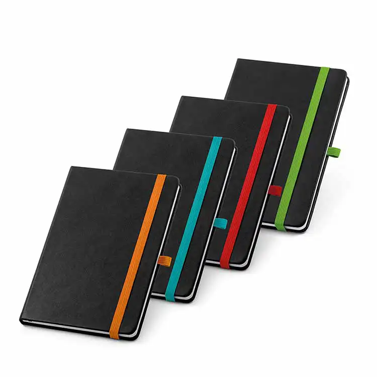 Caderno capa dura. PU térmico. 80 folhas pautadas. Suporte para esferográfica. Esferográfica não inclusa. 140 x 210 mm