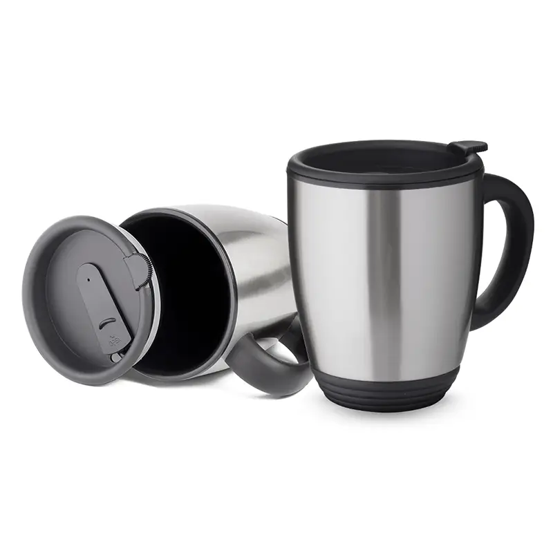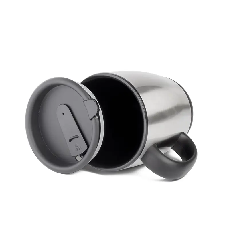Caneca em aço inox de 450ml, alça de mão plástica, tampa com vedação ideal para chás e cafés.