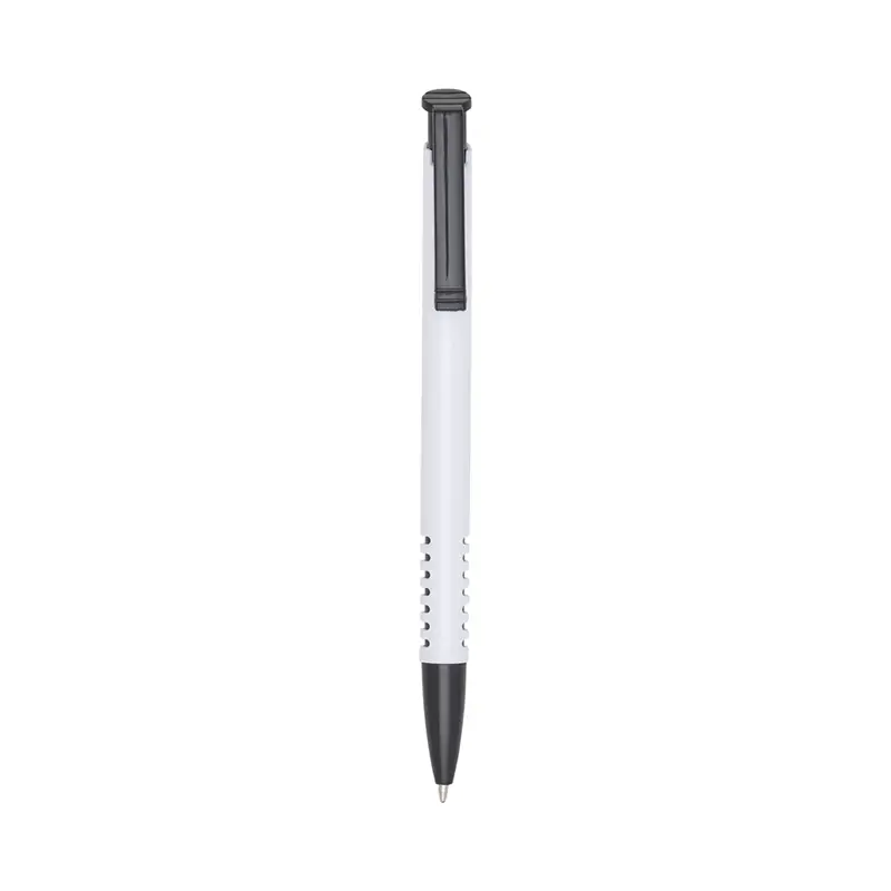 Caneta plástica com carga esferográfica azul e acionamento por clique.