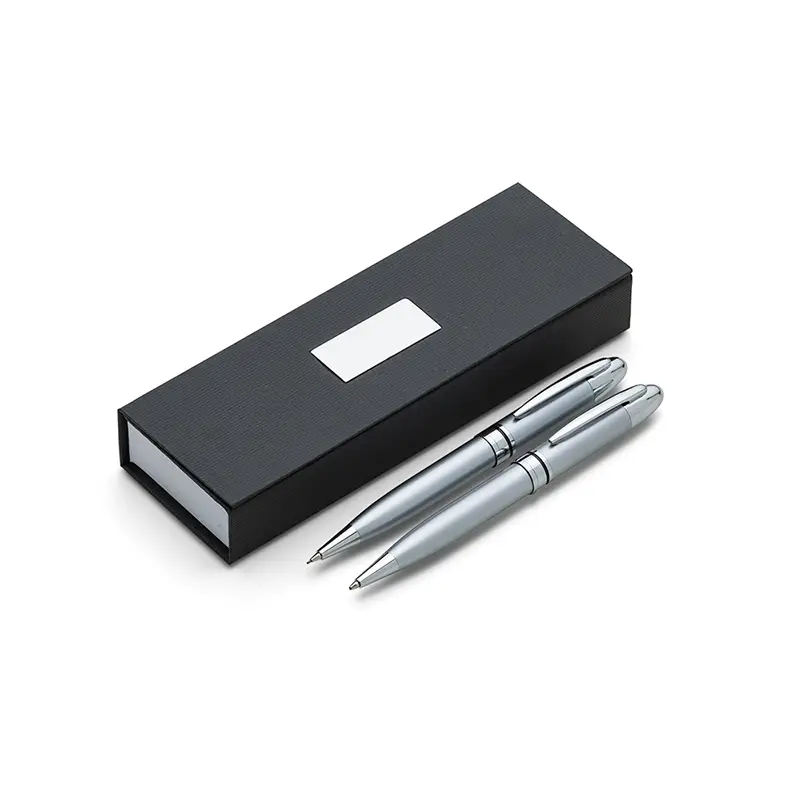Conjunto caneta e lapiseira em estojo de cartonagem com placa central para personalização. Clip metal e anel central possui: anel fino prata, anel preto fino e um anel maior prata com relevo e acionam por giro. Estojo revestida com espuma na parte interna.