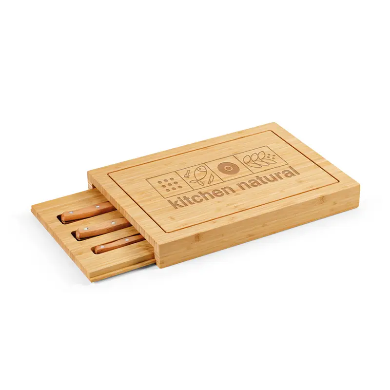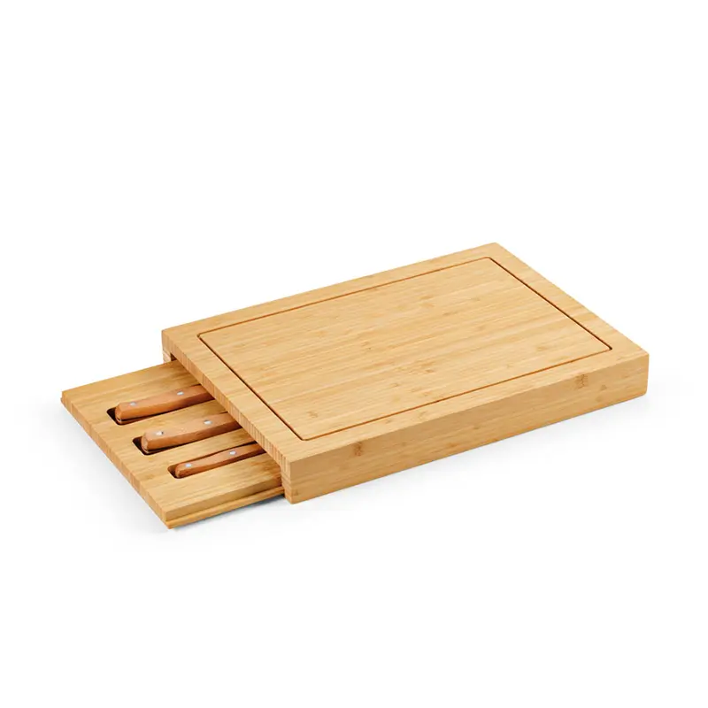 Conjunto de tábuas em bambu com 3 facas inclusas. Composto por duas tábuas: a tábua exterior e a tábua interior que assume duas funcionalidades - um compartimento para três facas inclusas (faca de legumes, faca de pão, faca de cozinha) e como tábua de corte.