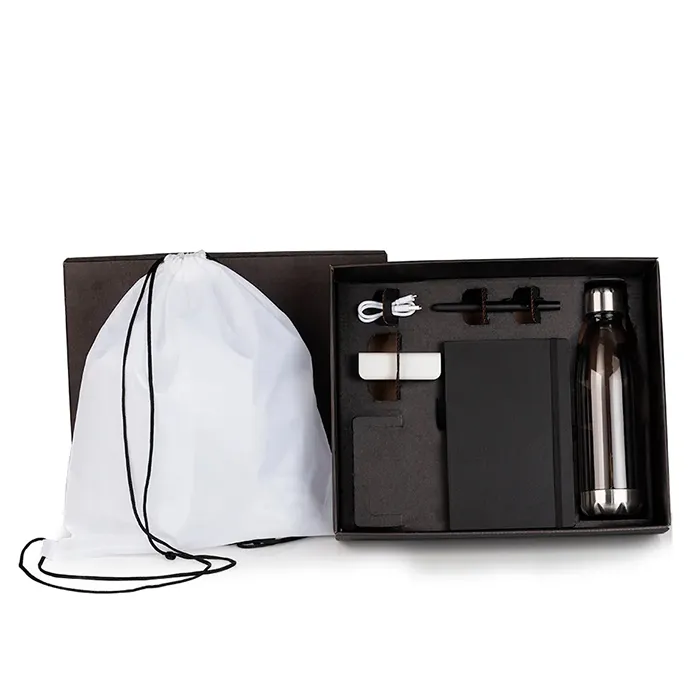 Kit boas vindas. Conta com garrafa plástica com tampa em aço inox 750ml, caderno capa dura, caneta esferográfica com tampa e ponta touch, mochila sacola em Nylon e carregador portátil 1.800mah. Um kit ideal para presentear novos funcionários.