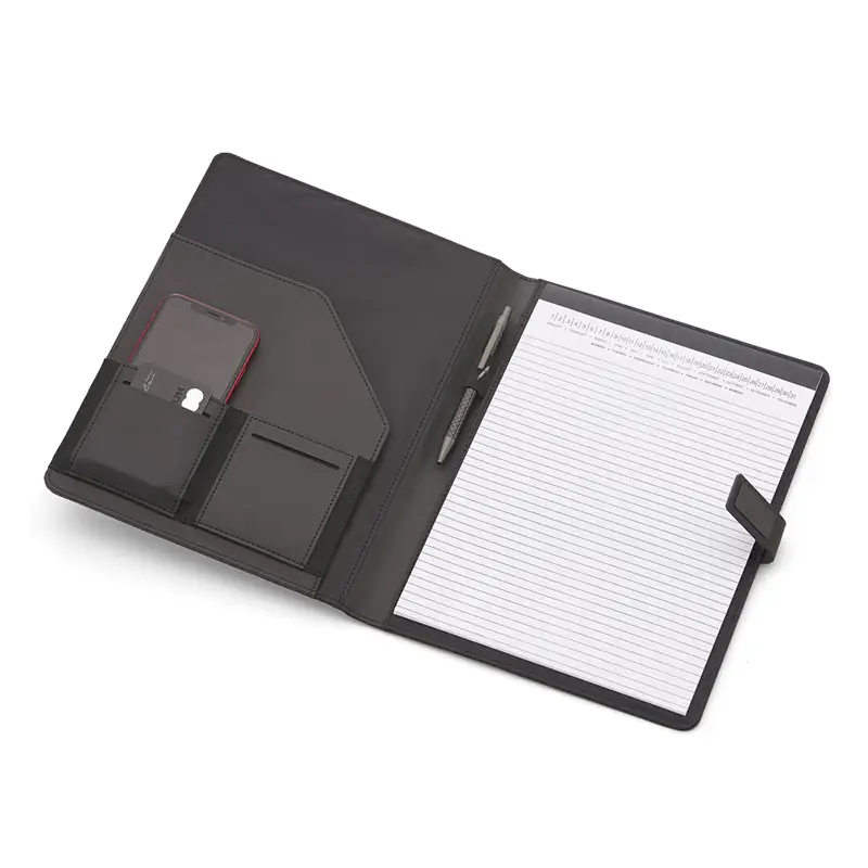 Pasta Executiva Almofadada com caderno de 20 folhas A4, Bolso na capa 8x12cm, Bolso interno para Cartões, Telefone e Documentos, Fechadura Magnética, Não acompanha caneta.