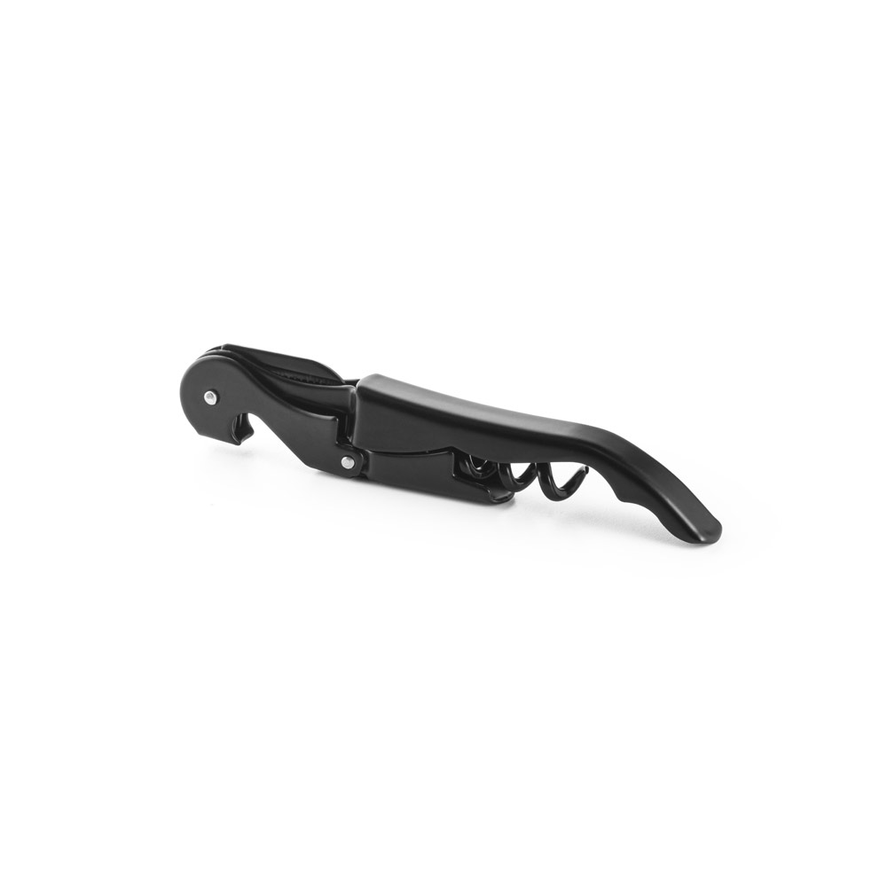 Saca-rolhas preto em metal e PP com abridor de garrafas e canivete de sommelier. Espiral em aço inox.