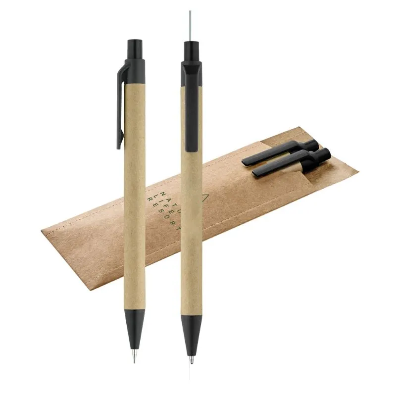 Conjunto de esferográfica e lapiseira em papel craft com clipe e ponteira de plástico. A l apiseira é de 0.5 mm. Fornecido com uma bolsa em cartão.