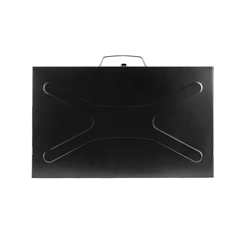 Churrasqueira feita em metal com funcionamento a carvão.Possui formato compacto e pode ser transportada como uma maleta quando desmontada, além de alça para transporte, trava de segurança para fechamento e quatro pés retráteis. Acompanha uma espátula e espeto duplo com cabo em madeira.