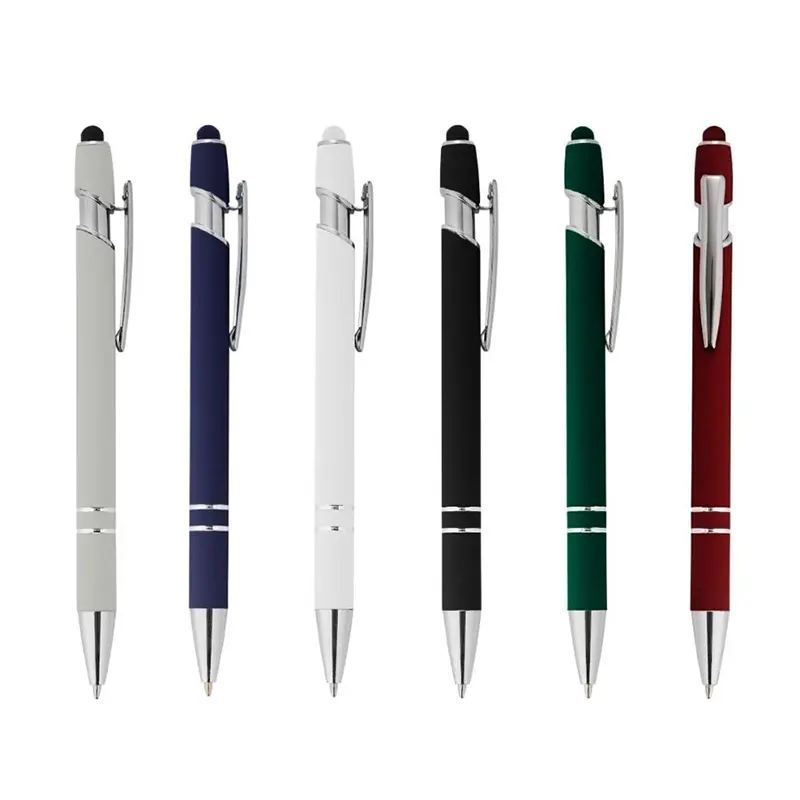 Caneta metálica touchscreen com acabamento similar à borracha, acionamento por clique e carga esferográfica azul 1.0mm.