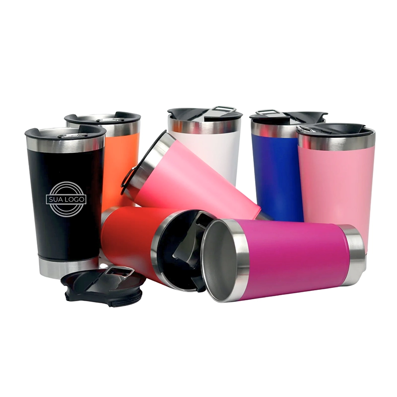 Copo térmico de inox com acabamento liso e capacidade 500ml, material livre de BPA. Contém tampa com abridor.