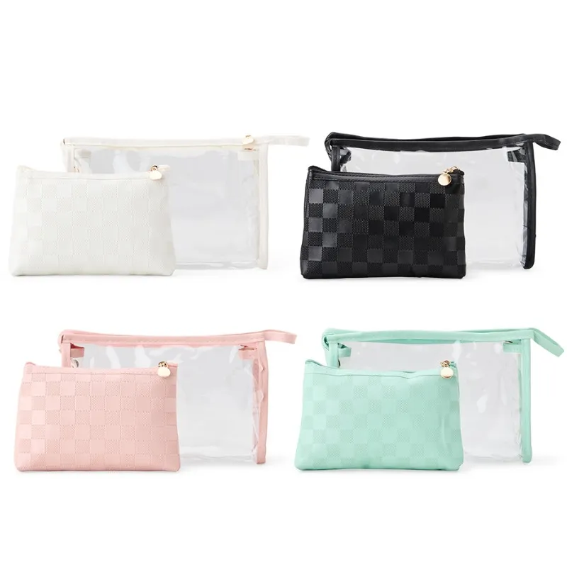 Uma dupla de nécessaires que se complementam e oferecem as possibilidades de organização. O nécessaire maior é feito em PVC impermeável, com detalhes e alça lateral em couro sintético, além de fechamento em zíper. O nécessaire menor, por sua vez, é confeccionado inteiramente em PU impermeável, apresenta fechamento em zíper e design compacto.