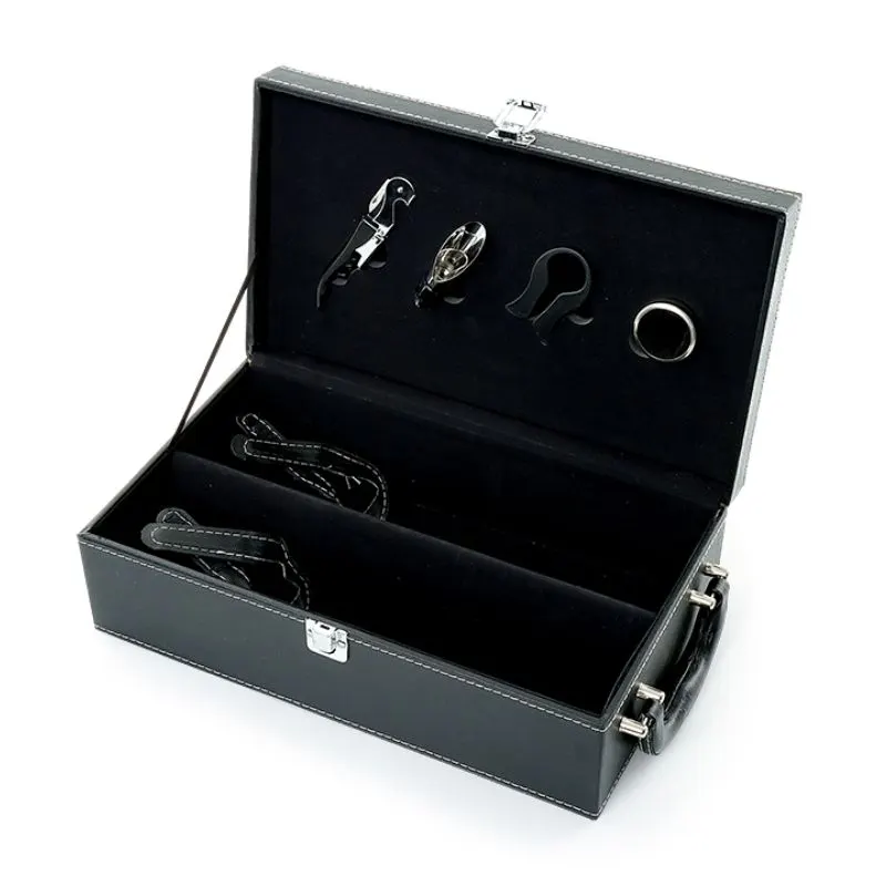 Kit vinho 4 Peças em maleta de sintético com duas repartições para garrafas. Contém saca-rolhas metálico, bico condutor com tampa, cortador de lacre e wine collar. Maleta com alça e trava de segurança, área interna revestida de veludo com suporte em couro sintético e velcro em cada repartição para fixação das garrafas.