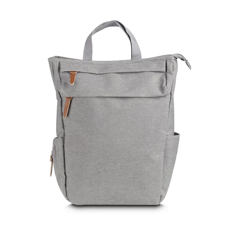Mochila Multifuncional em poliéster 300D com detalhes em PU e interior em 210D. Possui alça de mão, alça para ombro e engate para carrinho de bebê. Conta com 2 bolsos laterais, 2 frontais com zíper e 2 compartimentos traseiros com zíper. O interior inclui divisórias, uma delas térmica, e uma divisória com zíper. Prática e versátil.