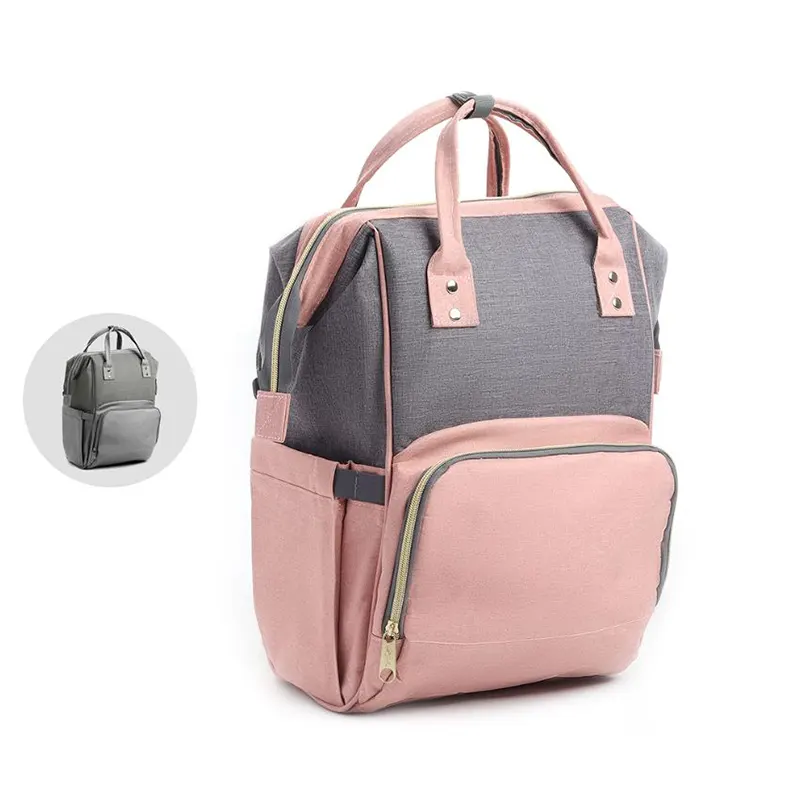 Parte externa: Compartimento com divisórias internas, alça para encaixe para carrinho de bebê, 2 bolsos laterais, bolso frontal com divisórias internas com zíper, alça de mão, compartimento com zíper nas costas da mochila.