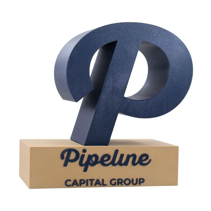 Troféu logo base tipo madeira, impresso em PLA, feito em impressora 3D.