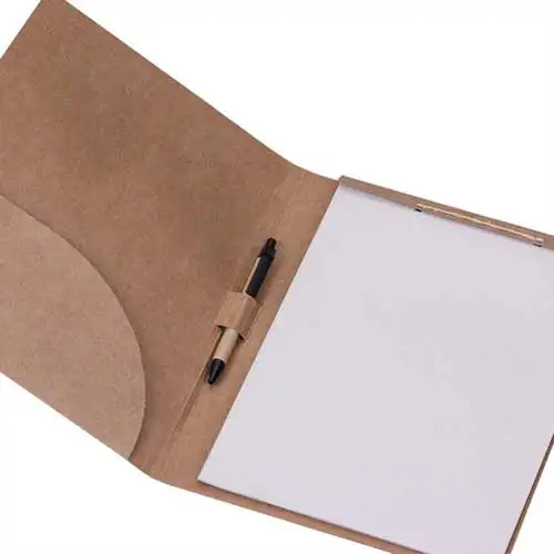 Pasta convenção ecológica, modelo kraft. Frente e verso da capa lisos, possui bolso interno, suporte com caneta(detalhes preto) ecológica de papelão, aproximadamente 30 folhas ecológicas tamanho A4 presas ao suporte com uma corda.