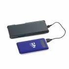 Bateria portátil com ecrã touch e indicador de carga. ABS e aço inox. Bateria polímero de lítio. Capacidade: 4.000 mAh. Tempo de vida = 500 ciclos. Entrada 5V/1A e saída 5V/1A. Incluso cabo USB/micro USB para carregar a bateria.