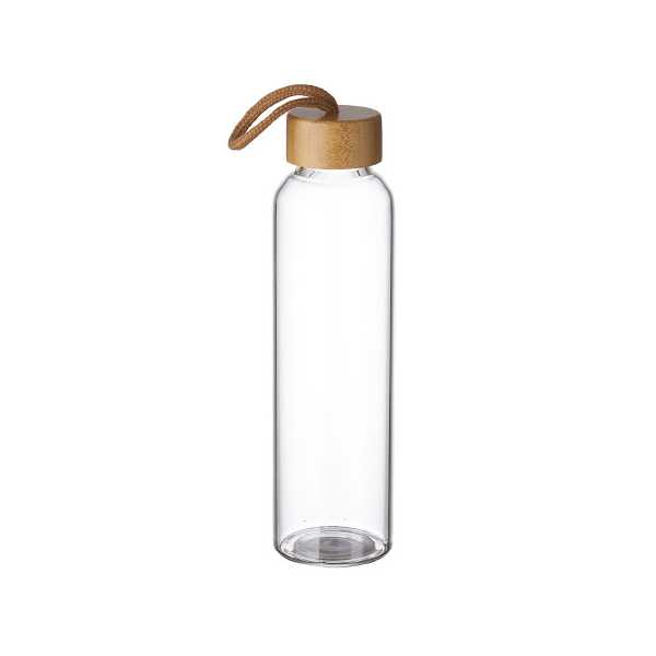 Garrafa de vidro com tampa personalizada, ela possui tampa rosqueável feita de bambu com alça em cordão e capacidade de 600 ml. Brinde elegante ideal para fidelizar clientes possui boa área de personalização da logomarca aplicada em laser