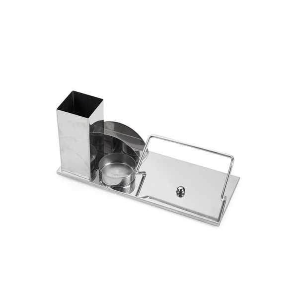 Organizador de mesa personalizado, feito de aço inox, ele possui suporte para celular, porta clipes, porta canetas e porta cartão. Brinde útil com boa área de impressão da logomarca aplicada em laser