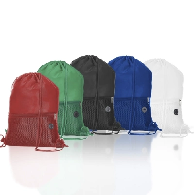 Mochila saco confeccionada em poliéster. Possui compartimento principal superior, bolso frontal de malha com zíper e saída para fone de ouvido.