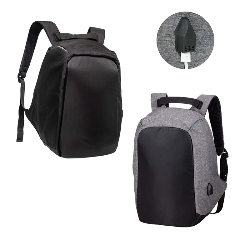 Mochila antifurto de poliéster com detalhes em nylon. Com formato anatômico e design moderno, tem a parte frontal à prova de água e tecido impermeável. Pensando na segurança do usuário foi confeccionado o compartimento principal na área traseira, impossibilitando a abertura do produto mesmo com a mochila na costa do usuário. Possui suporte com entrada USB na parte externa e cabo USB acoplado internamente; permitindo a conexão de um carregador portátil na área interna e a conexão de um eletrônico na área externa, viabilizando a carga e utilização do eletrônico enquanto caminha. Área interna do compartimento principal: bolso para notebook 14 polegadas, quatro bolsos para acessórios, bolso com zíper; possui nas laterais internas sistema de velcro, maximizando a segurança da mochila. Alças para as costas ajustáveis revestidas com espuma para um maior conforto sendo uma delas com bolso de zíper, alça para mãos e alça horizontal para encaixe em malas de viagem.