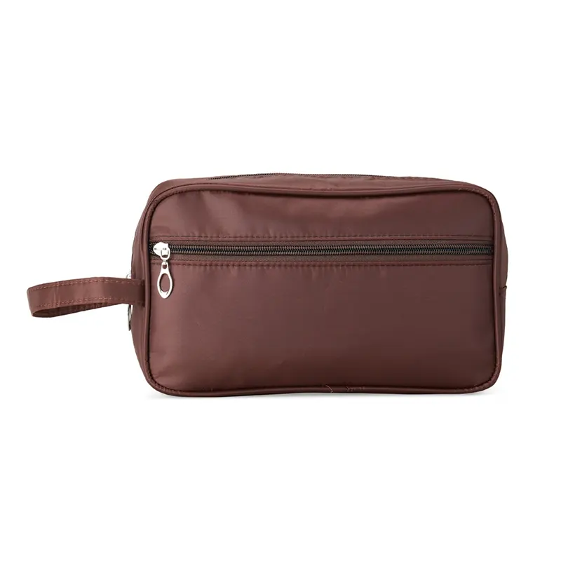 Nécessaire confeccionado em poliéster resistente à água e fechamento em zíper. Possui bolso frontal e uma alça de mão costurada na lateral.