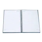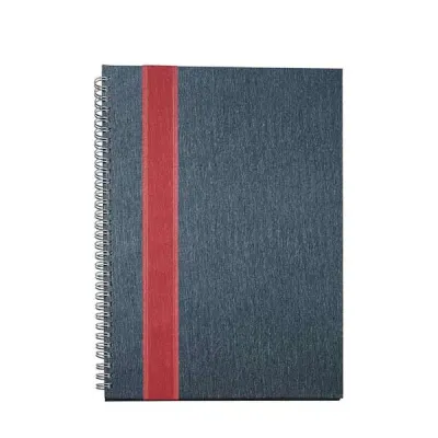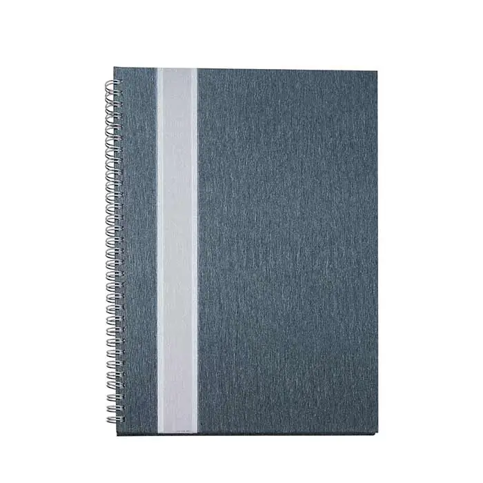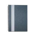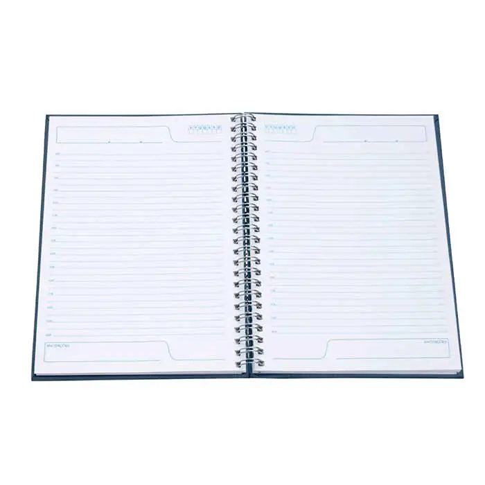 Caderno grande com faixa lateral frontal e verso liso. Pintura texturizada e wire-o prata, possui: folha/envelope plástico, dados pessoais e comerciais, calendário de 2016 à 2019, endereços da internet e índice telefônico. Tem aproximadamente 98 folhas brancas pautadas.